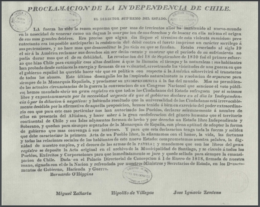 Aunque O’Higgins tenía proyectado realizar la Proclamación de la Independencia el día 1º de enero de 1818 en Concepción, el acto tuvo que ser aplazado para el 12 de febrero de ese año. Ese día el Director Supremo firmó en Talca junto a los ministros de Gobierno, Hacienda y Guerra el documento que consagraba la Independencia de nuestra nación.